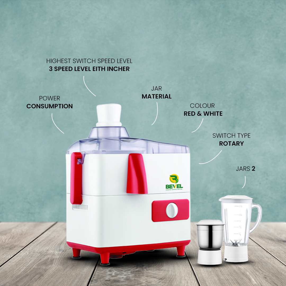This powerful and durable appliance features a 500 Watt motor that can easily handle tough grinding tasks, making it perfect for preparing chutneys, masalas, and other cooking essentials. With three stainless steel jars of varying sizes, the Bevel Surakav Juicer Mixer Grinder offers ample space for all your ingredients, making it perfect for large families or entertaining guests. The mixer grinder also features three-speed settings, allowing you to control the grinding process and achieve the desired texture. The juicer attachment is perfect for extracting juice from your favorite fruits and vegetables, adding a healthy twist to your daily diet. The overload protection mechanism ensures that the appliance automatically shuts down in case of overload, protecting it from damage and ensuring a longer lifespan. The Bevel Surakav Juicer Mixer Grinder also comes with an incher for precise control over the grinding process, making it perfect for grinding small quantities or achieving a specific texture. The stylish red and white design adds a touch of elegance to your kitchen decor. Bring home the Bevel Surakav Juicer Mixer Grinder today and take your culinary skills to the next level!